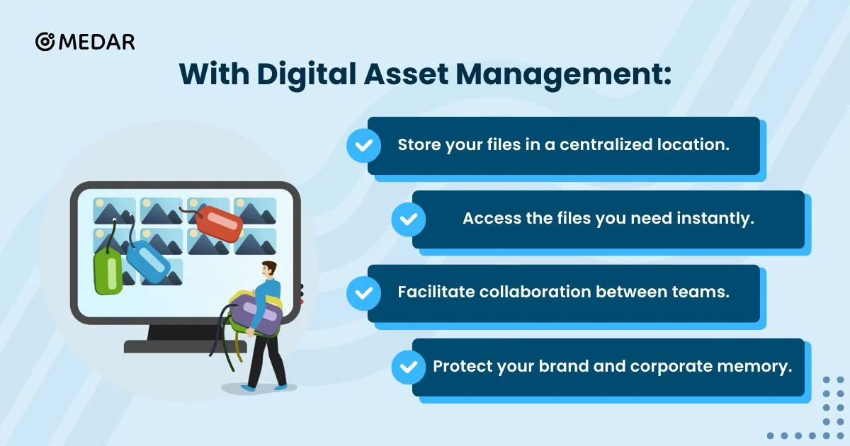 One of these tools is a DAM system, which frees you from the chaos, insecurity, and repetitive tasks of traditional file management.