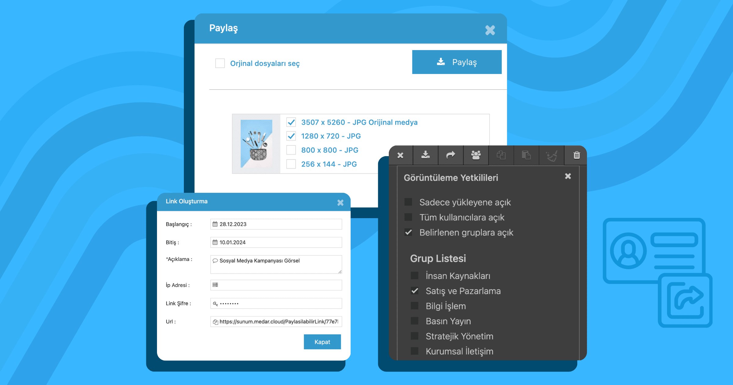 Dijital varlık yönetimi yazılımlarında paylaşılmak istenilen dosyalar için şifre korumalı ve süreli linkler oluşturuluyor. İlgili taraflarla linkler paylaşılıyor. Böylece dosyalar direkt olarak değil, bir link üzerinden iletilmiş oluyor. Bu yapı sayesinde kurumsal veri niteliği taşıyan dosyalar, WeTransfer, dosya sıkıştırma siteleri, WhatsApp gibi üçüncü taraf uygulamalarla paylaşılmamış oluyor. Hem paylaşım süreçleri hızlanıyor hem de kurumsal veriler kontrol altına alınıyor.