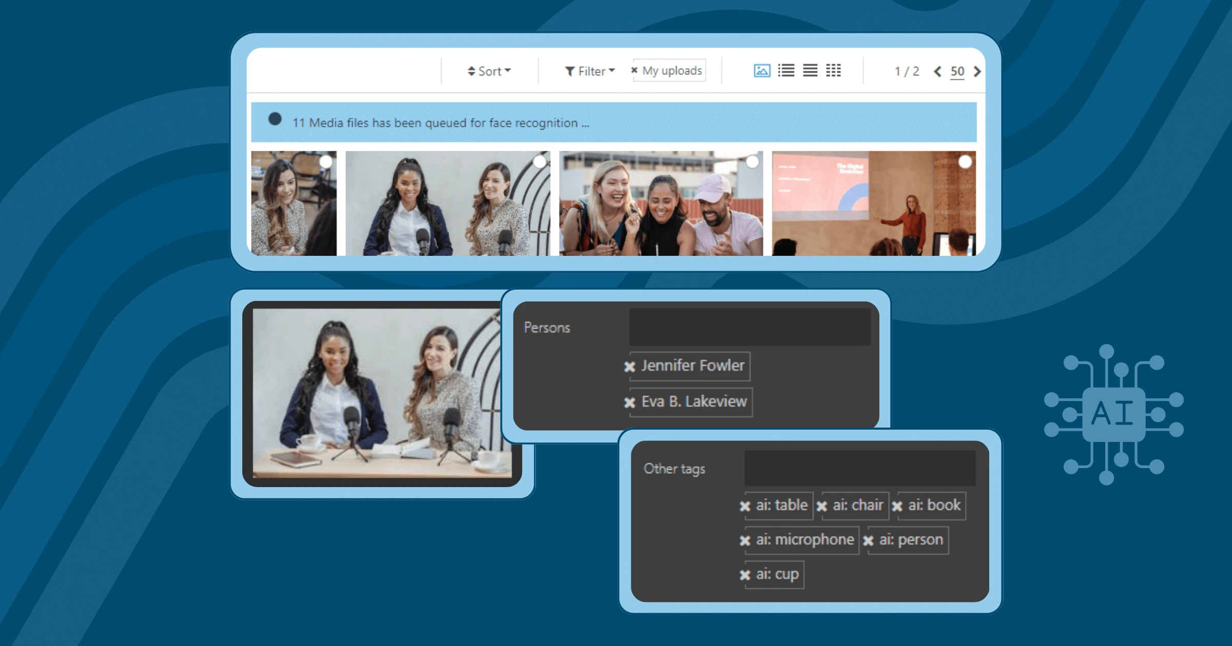 - Tagging: Files are manually tagged based on categories such as event, location, time, and person. Artificial intelligence support enables automatic tagging for people, speech, and objects.