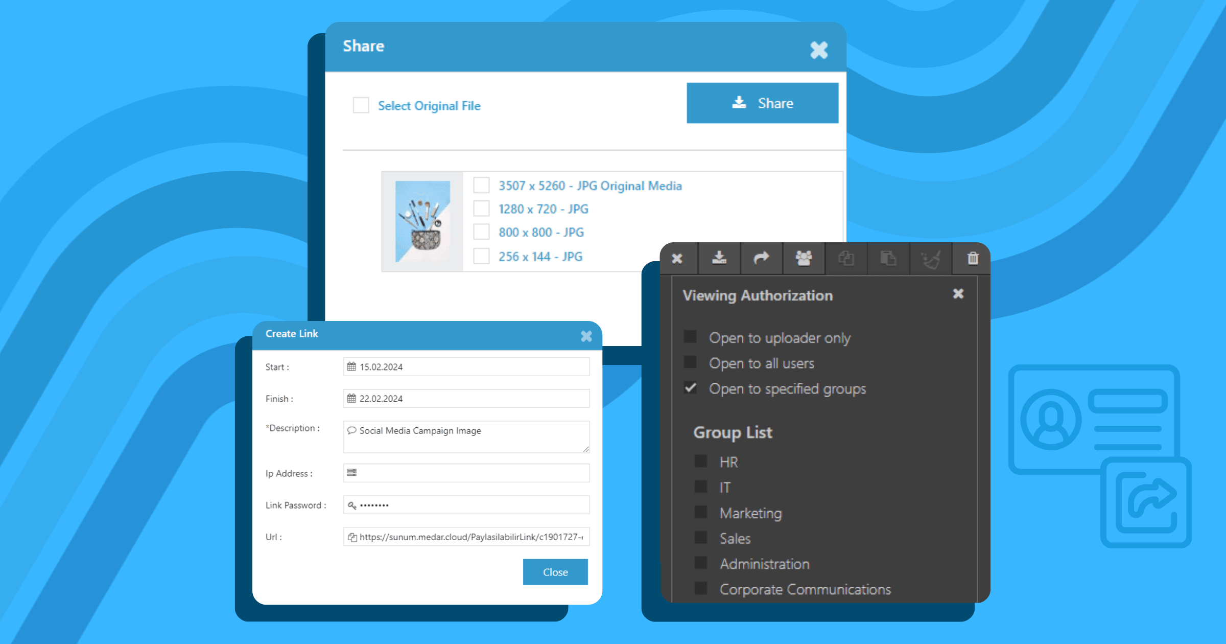 In digital asset management software, password-protected and time-limited links are generated for files intended to be shared. These links are then shared with relevant parties, allowing the files to be transmitted via a single link. This structure ensures that files containing corporate data are not shared via third-party applications such as WeTransfer, file compression sites, or WhatsApp. This not only speeds up the sharing process but also ensures better control over corporate data.